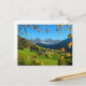 Postkarte des Dorfes St. Magdalena oder Santa Maddalena mit der charakteristischen Kirche vor den Geisler- oder Dolomiten-Berggipfeln im Val di Funes (Villnoesstal) in Italien im Herbst umgeben von Herbstblättern.