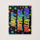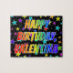 This lively and vibrant birthday-themed jigsaw puzzle design feature the message "HAPPY BIRTHDAY, VALENTINA" with the characters having a colorful rainbow spectrum inspirred gradient pattern, along with a fun field of stars background pattern. In Colorful Puzzle like this might be a fun way to send a birthday greeting message to somebody named Valentina. [~ Z0000468]