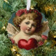 Auf dieser Valentinstag-Schmuckkarte ist ein hübsches, Vintages Bild eines Valentinstag-Engels mit rotem Herzen zu sehen. An der Vorderseite der Schmuckkarte befindet sich ein Bild eines Valentinstag-Engels. Die Rückseite der Papier-Schmuckkarte ist ein tiefroter Hintergrund und liest sich in weißer Schrift "Happy Valentine's Day". Eine hübsche Art, eine Schmuckkarte an diese besondere Person in Ihrem Leben zum Valentinstag zu schicken!