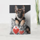 Valentinenkarte des Deutschen Schäferhirds. Knuddeliges Set aus Hunde vor einem zeitgenössischen Hintergrund in Rot, Schwarz und Weiß. Keine Blume, nur Herz und Tüten der Süße. Im Inneren wird für Ihre eigene Nachricht leer verlassen.