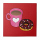 Illustration einer Schokolade mattiert, überzogen mit Herzstreuern und serviert mit einer Tasse Kaffee in einer rosa Tasse mit einem Herz.