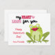 Hier ist eine lustige Valentinstag Postkarte für Kinder oder Erwachsene! Es hat einen grünen Frosch mit großen Augen und großen roten Lippen. Über dem Frosch steht der stilisierte Text "Mein Herz springt für dich". Es gibt zwei Textfelder auf der Vorderseite, die Sie anpassen können. Bild und Text werden auf einem weißen Hintergrund platziert. Wenn Sie möchten, können Sie Text auf der Rückseite hinzufügen, indem Sie "Anpassen." *Clip Art, die in diesem Design verwendet wird, ist urheberrechtlich geschützt durch Encore Software, Inc., die die Verwendung für ihre Lizenzgeber erlaubt. Alle Rechte vorbehalten.