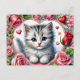 This floral postcard features a watercolor painting of a cute kitten with a Valentine's Day theme. The blue-eyed kitten has a gray tabby-like coat and is framed by a larger heart.