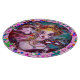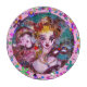 Whimsikisches vibrierendes und künstlerisches Gemälde mit bunten Konfetti. Mythische Liebe zwischen Harlequin und Columbine, Akrylmalerei inspiriert von Venezianischen Federmasken und Commedia dell'arte - Venedig. Helle, lila rosa, gelbe grüne Farben.