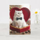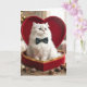 A charming white Persian cat, elegantly dressed in a chic black bow tie, is sitting in a delightful red Valentine's Day chocolate candy box.