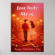 This Valentine’s Day Love Quote Poster captures a quiet, heartfelt moment between a couple walking hand in hand under glowing street lights. The soft quote “Love looks like us” pairs beautifully with warm red tones, floating hearts, and floral accents, creating a romantic and cozy atmosphere.
