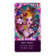 Whimsikisches vibrierendes und künstlerisches Gemälde mit bunten Konfetti. Mythische Liebe zwischen Harlequin und Columbine, Akrylmalerei inspiriert von Venezianischen Federmasken und Commedia dell'arte - Venedig. Helle, lila rosa, gelbe grüne Farben.