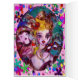 X Alphabet Buchstaben Anfangsdesign mit Herz. Whimsikisches vibrierendes und künstlerisches Gemälde mit bunten Konfetti. Mythische Liebe zwischen Harlequin und Columbine, Akrylmalerei inspiriert von Venezianischen Federmasken und Commedia dell'arte - Venedig. Helle, lila rosa, gelbe grüne Farben.