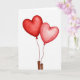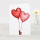 This greeting card shows a watercolor scene with two heart-shaped balloons floating on a plain white background. One heart is a deep red and sits a bit higher on the left, with soft shading that makes it look rounded. The other heart is a lighter pinkish red on the right, slightly lower, and it has small speckled paint marks that give it a handmade feel. Thin red strings hang down from both hearts and lead to two small brown cylinder shapes along the bottom edge, like simple weights holding them in place. There’s no text on the front, so the hearts are the whole message and keep the focus on love and closeness. The overall look feels gentle and sweet, like a quiet reminder that someone is on your mind ❤️❤️