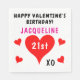Herzlichen Glückwunsch Valentins Geburtstag in schwarzer Typografie. Name in hübsch leuchtendem Rosa. 21. oder jedes Alter, das in einem größeren Herzen geschrieben ist. Kleinere rote Herzen und XO vor knusprigem weißem Hintergrund. Original Artwork and Design von TamiraZDesign.