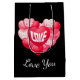 Die Geschenktasche aus Papier wird in schwarz mit einem Valentiner Ballonherzen gedruckt. Passen Sie diese Geschenktasche an oder kaufen Sie, wie es ist.