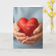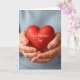 Eine ältere Frau mit einer weichen blauen Strickjacke hält sanft ein rotes Herz in den Händen.
