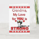 Niedlich Valentinstag Grußkarte für eine Oma. Ein muskulöser Pinguin hebt Herzgewichte und ein Schatten wird dahinter geworfen. Das Wort STRONG hat den Buchstaben O in eine Herzform gequetscht. Pinguin Element dank HGomez/Openclipart. Art, Bild und Vers Copyright © Shoaff Ballanger Studios.