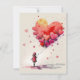 Eine Valentintagskarte mit roten Herzblasen. Die Vorderseite der Karte zeigt ein junges Mädchen, das Valentinballons hält. Der Rücken sagt: Gehört zu meinem Valentin. Dies ist eine flache Karte mit Platz auf der rosa Rückseite, um Ihre Nachricht zu schreiben.