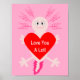 Dieses Poster zeigt ein digitales Kunstbild eines niedlichen axolotl, eines mexikanischen Salamander, der ein rotes Herz trägt. Der Axolotl ist hellrosa mit riesigen schwarzen Augen und einem großen rosa Lächeln. Es hat hellrosa Feathery Kiemen auf der Kopfseite und einen hellen rosa Tuch auf dem Schwanz. Es ist rosa Text im Herzen, der Liebe You a Lotl liest.