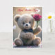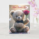 Ein flauschiger Teddybär mit einer schwarzen Bogen-Krawatte hält eine Single-rote Rose mit langen Stangen, umgeben von sanft leuchtenden Herzformen. Alle Texte können geändert werden.