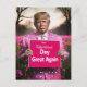 Ein humorvolles Porträt mit einer bekannten Figur namens Donald Trump, die in einem rosa, mit einem Herz bedeckten Anzug gekleidet ist und ein Schild trägt, das lautet: "Gestalten Sie den Valentinstag wieder groß." Set vor einem landschaftlichen Hintergrund rosa Blume kombiniert dieses spielerische Bild die Themen des Valentinstag mit einer politischen Drehung und verbindet Romantik und Satire.