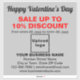 Herzlichen Glückwunsch zum Valentinstag! Ein schöner Urlaub, um diesen Februar zu feiern und auch Ihr Geschäft zu werben oder um Ihren Markennamen zu fördern. Maßgeschneiderter Vierkantsticker mit Valentine Sale, Ihrem Firmennamen und weiteren Informationen. Vinyl Aufkleber, dass Sie als Marketing Material verwenden können, um mehr Kunden anzuziehen. Anpassen und anzeigen, um mehr Kunden davon zu überzeugen, Ihre Produkte oder Kunden zu kaufen, um Ihre Dienstleistungen zu mögen. Designfarben sind schwarze und rote Texte auf grauem Hintergrund. Inhalte sind Glückwunsch Valentinstag Gruß, Verkaufstexte mit Prozent Rabatt, die Sie anbieten, Verkaufstermine, Ihr Firmenname, Logo, Adresse, Telefonnummer, E-Mail und Website oder Ihre Business Social Media-Seite. Bitte Karo des Erscheinungsbildes nach dem Hochladen von Logos und Schriftzeichen. Wenn Ihnen das Aussehen gefällt, können Sie jetzt Ihre Bestellung aufgeben. Wenn Sie das Logo und die Texte ändern und verschieben müssen, um auf diesen Aufkleber oder auf die gewünschte Größe zu passen, ändern Sie bitte das Design-Tool. Sie können auch die Hintergrundfarbe, die Farbe des Schriftartes und den Stil des Schriftartes im Designwerkzeug ändern. Herzlichen Glückwunsch zum Valentinstag! Wir wünschen Ihnen mehr Umsatz in diesem Urlaub.