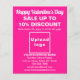 Herzlichen Glückwunsch zum Valentinstag! Ein schöner Urlaub, um diesen Februar zu feiern und auch Ihr Geschäft zu werben oder um Ihren Markennamen zu fördern. Individueller Flyer mit Valentine-Verkauf, Ihr Firmenname und andere Informationen über Ihr Geschäft, ein Marketing-Material, das Sie verwenden können, um mehr Kunden anzuziehen. Passen Sie es an und vertreiben Sie es, um mehr Kunden zu gewinnen, Ihre Produkte oder Kunden zu kaufen, um Ihre Dienste zu mögen. Designfarben sind weiße Texte auf rosa Hintergrund. Um diesen Flyer anzupassen, geben Sie den prozentualen Rabatt an, den Sie anbieten und den Verkaufstermin. Laden Sie auch Ihr Firmenlogo hoch, geben Sie Ihren Firmennamen, Ihre Adresse, Telefonnummer, E-Mail und Website oder Ihre Social Media-Seite ein. Bitte Karo nach der Texteingabe und dem Hochladen des Logos auf der Vorder- und Rückseite. Wenn Ihnen das Aussehen gefällt, können Sie jetzt Ihre Bestellung aufgeben. Wenn Sie die Größe des Textes und des Logos ändern und verschieben müssen, um auf diesen Flyer oder auf die gewünschte Größe zu passen, ändern Sie bitte das Design-Tool. Sie können auch die Hintergrundfarbe, die Farbe des Schriftartes und den Stil des Schriftartes im Designwerkzeug ändern. Herzlichen Glückwunsch zum Valentinstag! Wir wünschen Ihnen mehr Umsatz in diesem Urlaub.
