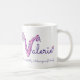Verzierter Hand gezeichneter Buchstabe mit Ihrem eigenen Namensanfang mit der v- und Namenbedeutungs-Tasse. Hübsche Herz- und Blumen-Hauptstadt V kritzelte den typografischen Entwurf, der Herzen und Blumen kennzeichnen und die Wörter starken und gesunden Valerie. Eine tapfere starke Schönheit in rosa und in Lila. © einzigartige Kunst und Entwurf durch Sarah Trett. www.sarahtrett.com für www.mylittleeden.com auf zazzle