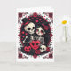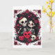Eine reich verzierte, volkstümliche Illustration, die sich auf ein liebendes Skelettpaar konzentriert. Sie sitzen eng beieinander in einem aufwendigen ovalen Rahmen, der mit winzigen roten Herzen gefüllt ist. Das männliche Skelett trägt einen schiefen Zylinder und eine kleine Fliege, sein knochiger Arm liegt liebevoll um die weibliche Figur. Die Farbpalette ist begrenzt, aber auffallend: reines Knochenweiß, tiefes Schwarz und gesättigte Rottöne und Rosa, was der Komposition sowohl ein warmes, romantisches Gefühl als auch eine dezidiert gotische Note verleiht. Ein von Día de los Muertos inspiriertes Tableau, das sich sowohl zärtlich als auch spielerisch unheimlich anfühlt.