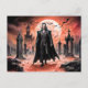 dunkler Vampir steht in einem unheimlichen Friedhof unter Vollmond, umgeben von Fledermäusen und einer Spuk Burg im Hintergrund.