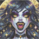 Halloween-Aufkleber. Weibliche Vampir mit goldenen Augen und Zähnen und Glitzern in ihren Haaren. Goldzähne, blasse Haut. Cool für Halloween oder jemand, der Vampire Lieben.