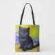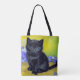 Tote Bag mit einer schwarzen Katze im Stil von Vincent van Gogh! Dieses mit Augen blaue Liebling sitzt mit violetten Blumen an einer grünen Wand und einem gelben Tisch. Ein wunderbares Geschenk für Katzenliebhaber und holländische Kunstsammler!
