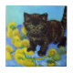 Fliese mit einer Van Gogh Katze mit Sonnenblumen! Ein hübsches, schwarzes Kätzchen mit Posen und gelben Blumen. Ein fabelhaftes Geschenk für Katzenliebhaber und holländische Kunstsammler!