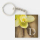 Vanille-Hülsen und Blume über hölzernem Schlüsselanhänger