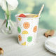 Con ilustraciones de frutas cítricas en tonos amarillos, verdes y naranjas, cada vaso trae consigo una explosión de colores brillantes que capturan la esencia del buen clima y la diversión.