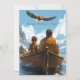 Hübsches Aquarellbild eines Vaters und Tochter, die angeln gehen, sitzen sie in einem Holzschiff auf einem schönen See. Es gibt einen schönen Bald-Adler, der über den hellblauen Himmel fliegt