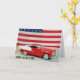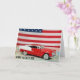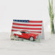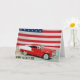 Altes rot-weiß 1955 Chevy Auto auf einer Straßenkarte mit amerikanischer Flagge Hintergrund für Vatertag. Text ist bearbeitbar.