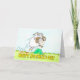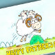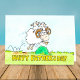Die Tageskarte dieses niedlichen Vaters, die im Stil eines Cartoon gezeichnet wurde, zeigt einen Widder, der über einen grünen Busch sprang, der auf einer Wiese stehend ist, vor einem blauen Himmel. Das männliche Schaf hat zwei kleine Lämmer auf dem Rücken, die sich mit ihrem Vater ganz klar amüsieren. Unter ihnen, auf dem Gras, sind die Worte "Happy Vatertag" in fett gelben handgeschriebenen Briefen geschrieben.