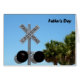 Das Schild Rail Road Crossing auf der Vorderseite der Karte mit Bäumen und einem blauen Himmelshintergrund. Perfekt für den Vater, der Lieben trainiert