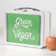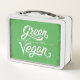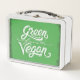 Auf einem neutralen Hintergrund wird eine weiße Metalldose mit einem schwarzen Griff und einem silbernen Verschluss angezeigt. Auf der Vorderseite der Mittagspause befindet sich eine grüne Tafel mit den Worten "Green Fresh Vegan" in einem stilisierten, kursiven, weißen Schriftart. Die grüne Tafel hat ein leicht bedrücktes oder strukturiertes Aussehen, mit dunkleren Kanten, die ihr einen Vintagen oder chalkboard-ähnlichen Effekt verleihen. Die weiße Schrift ist verziert, mit Schnörkeln und Wirbel, die den visuellen Reiz des Designs erhöhen. Die Lunchbox selbst hat abgerundete Kanten und eine glänzende Oberfläche, die Licht reflektiert und ihm ein sauberes, modernes Aussehen verleiht. Der Griff ist aus schwarzem Kunststoff mit einem strukturierten Griff, der silberne Verschluss ist einfach und funktionell. Die Gesamtkomposition ist sauber und gut beleuchtet, wobei der Schwerpunkt auf der Lunchbox und ihrem Design liegt.