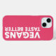 Diese Grafik zeichnet sich durch fett rosa Typografie aus, in der "VEGANS TASTE BESTER" hervorgehoben wird. Das Design setzt einen modernen, auffälligen Schriftart ein, der die positive Botschaft des Veganismus betont. Das helle Farbschema und der kräftige Text schaffen ein visuelles und ansprechendes Ambiente für alle, die den Lebensstil der Pflanze schätzen oder fördern. Dieses Stück kann als Slogan für eine vegane Kampagne, ein Restaurant oder eine Sensibilisierungsinitiative dienen