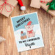 Diese Vegane Weihnachtspostkarte zeigt ein schönes Cartoon-Ferkel mit einem roten Hut und Schal und einige bunte Geschenke auf schneebedecktem Hintergrund mit der Beschriftung "Frohe Weihnachten zu meinem Lieblingsstift".