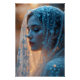 Das Nebenporträt einer friedlichen jungen Frau mit geschlossenen Augen, beleuchtet durch kontrastfarbenes Licht - warmes Orange von unten und cooles Blau von oben. Ihr Gesicht wird von einem glänzenden blauen Schleier mit feiner Stickerei gerahmt, während glitzernde Flecken auf ihrer Haut schimmern und in der umgebenden Luft treiben. Weichdampf zieht sich sanft um sie herum, mit einem subtilen Glühen, das die Tiefe erhöht. In hyper-realistischen Details mit einem traumhaften Hintergrund mit weichem Fokus, strahlt das Bild Ruhe und magische Schönheit aus.