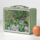Ein Rudel Velociraptoren jagen entlang eines Waldbaches auf der Vorderseite dieser Lunchbox.