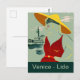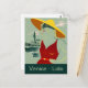 Postkarte von Venedig. Ein modischer Badeort und eine Frau in rotem Kleid. Postkarte mit einem Text, den Sie anpassen können.
