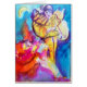 Farbenfrohe, skurrile und künstlerische Karnevalsmusiker im Mondlicht, Aquarellmalerei mit leuchtenden Farben in Rot, Rosa Fuchsienblau, Gelb. Charaktere inspiriert von Commedia dell'Arte und Karneval von Venedig und Venezianische Federmasken.