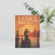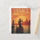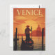 Ein romantisches Vintages Reiseplakat, das einen ruhigen Moment in Venedig, Italien, einnimmt. Die Abbildung zeigt einen Gondolierer, der sein Boot bei Sonnenuntergang auf dem Canale Grande lenkt. Die klassische Venezianische Skyline, einschließlich der ikonischen Kuppel von Santa Maria della Salute, ist mit einem warmen, orangefarbenen Himmel und der strahlenden Sonne versilbert. Dieses Retro-Design ist perfekt für diejenigen, die romantische Ziele, italienische Kultur und klassische Reisekunst Liebe haben. Es erinnert an ein Gefühl zeitloser Eleganz und macht ein schönes Dekor.