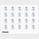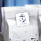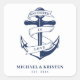 Nautische blaue und weiße Aufkleber für das Hochzeitsquadrat. Ideal für eine Hochzeit der Marine (Militär) oder des Seehauses. Das Design enthält einen Anker, der in einem Banner mit dem Text "In Liebe verankert" eingewickelt ist. Personalisieren Sie es mit Ihren Hochzeitsdetails.