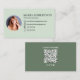 Dieses Design verfügt über eine einfache Visitenkartenvorlage mit einem modernen, beruflichen, minimalistischen Look, minimalen, eleganten Social Media Icons, einen trendigen, schlicht scannbaren QR-Code, einen schicken digitalen Kontakt, ein E-Mail-Webseiten-Icon, ein schlichtes Schwarz-Weiß, elegant minimalistisches Design, Foto- oder Grafikvorlage, zeitgenössisch sauberen, modernen Stil mit tropischen botanischen grünen Palmen Blätter Blattwerk