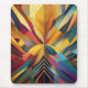 In der Mitte konvergiert eine lebhafte Reihe gewagter geometrischer Formen, die eine symmetrische und farbenfrohe Zusammensetzung bilden. Das Stück verwendet eine Vielzahl von Farbtönen, von warmen Gelbtönen und Orangen bis hin zu cooler Blues und Purpur.