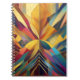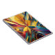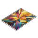 In der Mitte konvergiert eine lebhafte Reihe gewagter geometrischer Formen, die eine symmetrische und farbenfrohe Zusammensetzung bilden. Das Stück verwendet eine Vielzahl von Farbtönen, von warmen Gelbtönen und Orangen bis hin zu cooler Blues und Purpur.