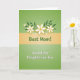 This card features a soft green gradient background that fades lighter toward the top, setting a calm, garden-like scene. Near the upper area, a cluster of white five-petaled flowers with warm golden centers nestles among long, deep green leaves, as if arranged with gentle care ❤️. A faint shadow under the floral group and across the middle gives the artwork a layered, cut-paper look that feels tender and close. Across the center runs a pale orange horizontal band, like a ribbon laid neatly over the green. Centered on that band, the words “Best Mom!” appear in dark green lettering, standing out clearly against the warm strip. Just below, on the green background, the line “Award For Daughter-in-law” is set in small white sans-serif text with a slight shadow, hinting at a sweet family bond 🌼. The palette stays springlike with fresh greens, sunny golds, crisp whites, and that soft orange band stretching straight from left edge to right edge.