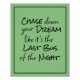 "Jage deinen Traum entlang, als wäre es der letzte Bus der Nacht" ist ein motivierend Satz, den du an deiner Wand sehen kannst. Schwarze Schrift und Rand. Moss grüner Hintergrund.