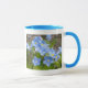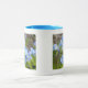 Tasse mit reizendem nahem hohem Foto von hellblauem vergessen mich nicht Blumen auf beiden Seiten